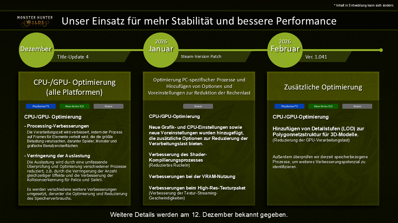 Im Januar 2026 erhält Monster Hunter Wilds ein Steam-spezifisches Update, welches zusätzliche Optimierungseinstellungen, Pre-Sets und Verbesserungen neben der Stabilitäts- und Optimierungsupdates, die auf allen Plattformen mit Titel-Update 4 erscheinen, bietet. Weitere Informationen zu Stabilitäts- und Performanceupdates zur Steam-Version finden sich auf der Website von Monster Hunter Wilds und den Monster Hunter Social-Kanälen.