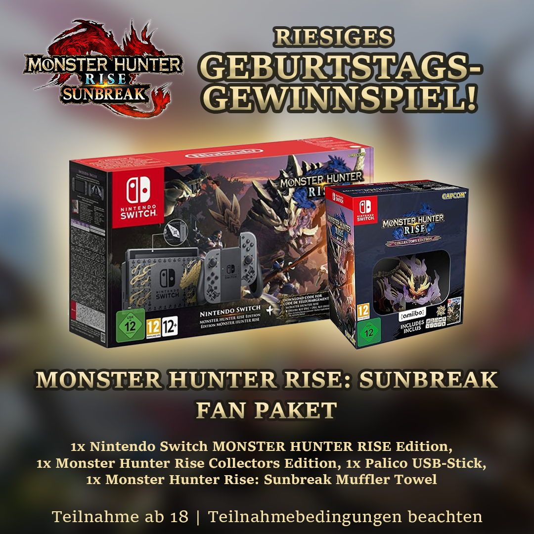 Wir feiern den 3. Geburtstag von Monster Hunter Rise: Sunbreak mit einem riesigen Gewinnspiel: Ihr könnt ein Monster Hunter Rise: Sunbreak Fanpaket gewinnen!
